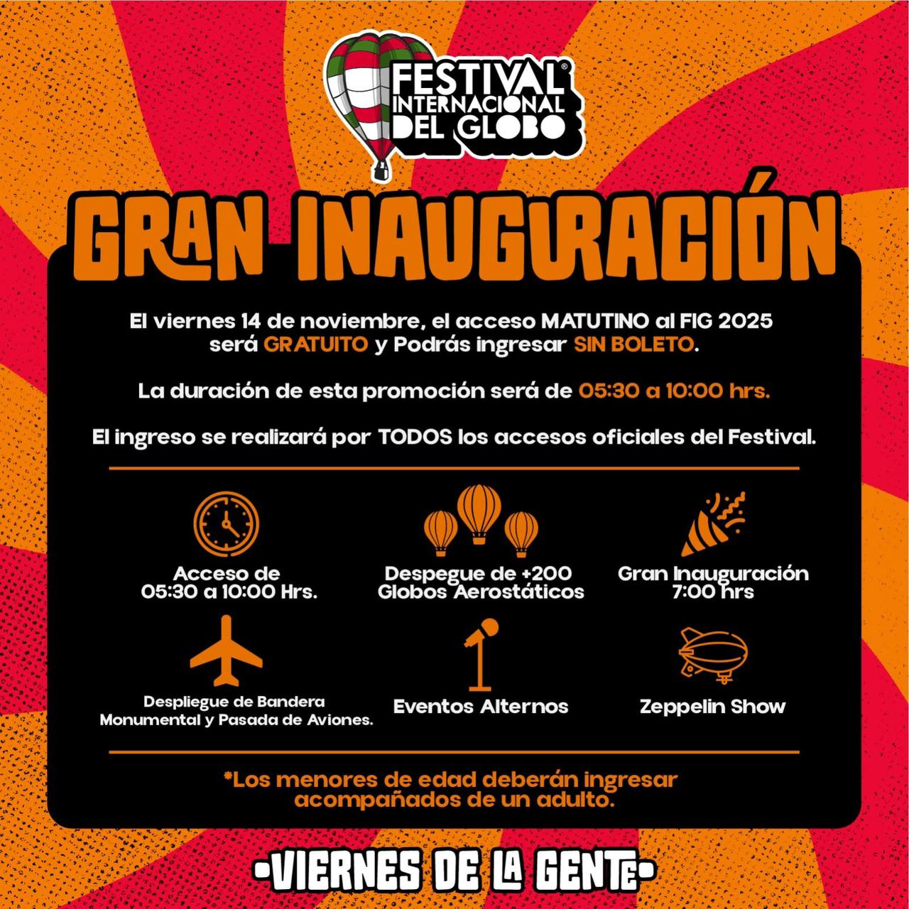 La iniciativa busca que nadie se quede fuera de uno de los festivales más esperados del país. “Viernes de la Gente” es una invitación a las y los leoneses para vivir la experiencia completa del FIG por la mañana sin costo, disfrutando los primeros despegues de globos aerostáticos, por la noche el acceso con costo será para el show inaugural de Gloria Trevi.