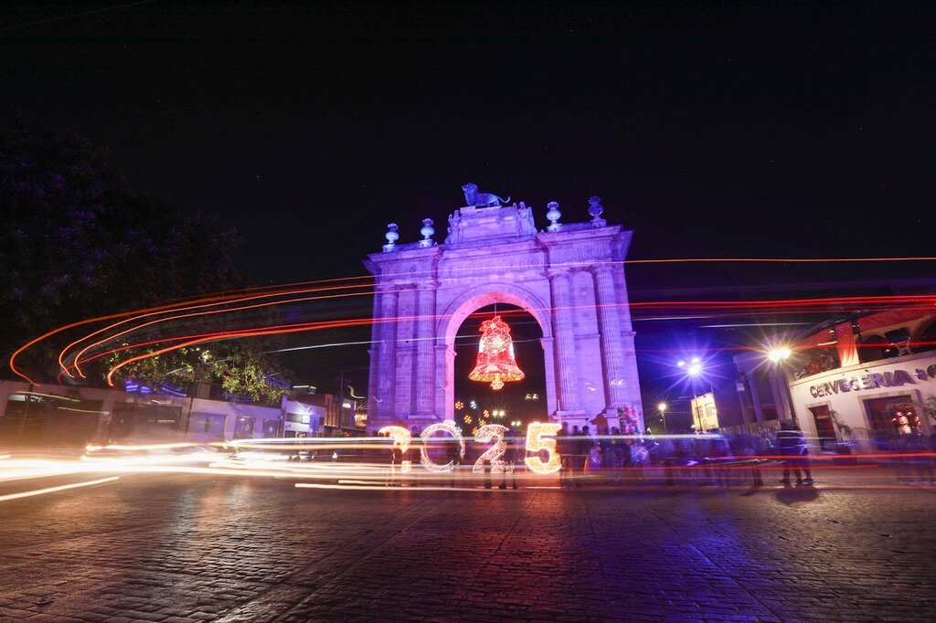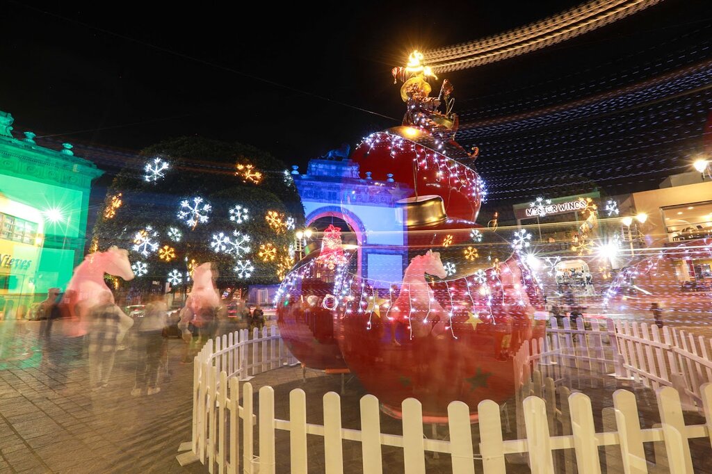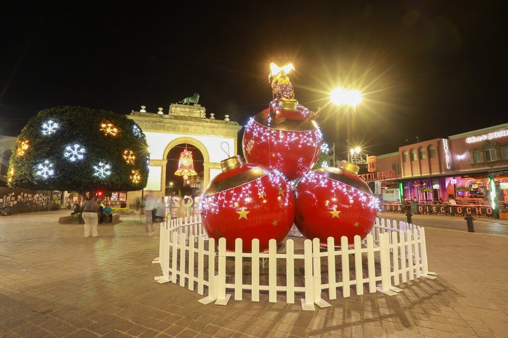 El encendido de la Navidad inició en el Arco de la Calzada donde las personas podrán observar la decoración navideña como una campana monumental, 4 esferas gigantes con un arlequín, Photo opportunity año 2025, decoración tipo copo de nieve en los árboles y arcos con Noche Buena.